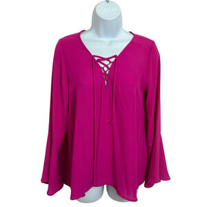 Nordstrom Eclair Fuchsia Blouse Sz Small Bell Sleeves Laced V-Neck Top Chiffon