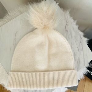 Stay cozily warm this season with a cashmere knit beanie with a faux fur pompom detail.
