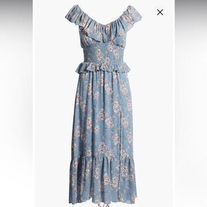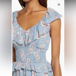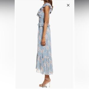 Soft chiffon is woven through with metallic thread for a touch of glimmer in this smocked, ruffled midi dress in a sweet vintage-looking floral print.