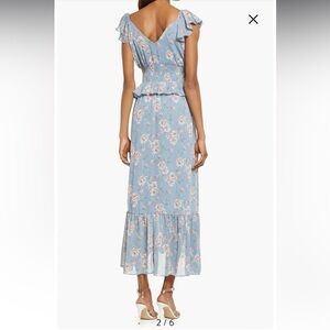 Can be worn off the shoulder. Slit on the right side is up to the knee. Ample skirt with ruffle. Lined down to the knee. This is more of a blue gray than what the pictures show