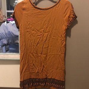 This is a gold shift dress with navy patterns purchased from Nordstrom. Its length is mid-way down the thigh. It has only been worn twice and is in great condition.
