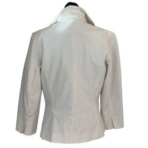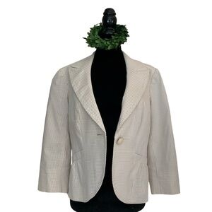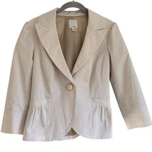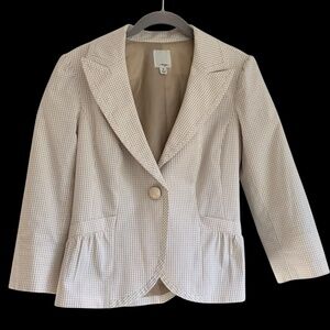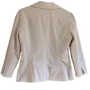 Nordstrom Halogen Brand tan and white cotton gingham jacket blazer. Size small. Collar and lapel trimmed with self fabric binding. Fully lined. Slight puffed shoulders. 3/4 bracelet length sleeves that can be folder over to create notched cuffs. Cropped, fitted at waist style. Cute, gathered front pockets.