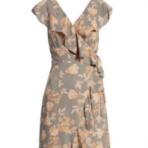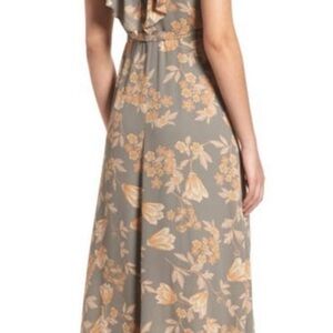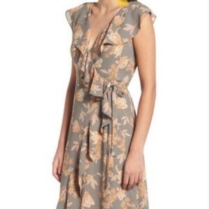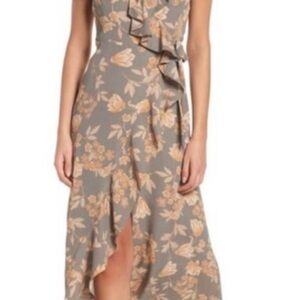 EUC Exclusively Nordstrom Brand Leith Dusty Grey Floral Wrap Midi Dress With Peach Cream Flowers, Ruffle Edges,V-Neck, Sleeveless, High Low, Lined to Knee
