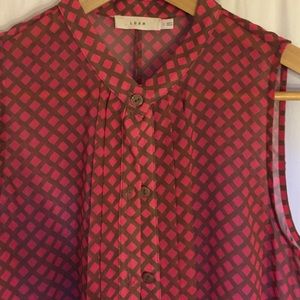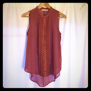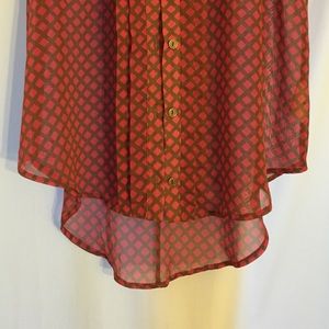 Cute Chinese collar sheer button blouse. All-over printed, High low hem, front pleat detail sheer top.