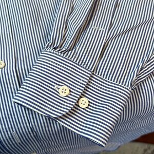 Button cuffs, center back pleat. Color: blue and white stripe.