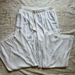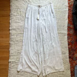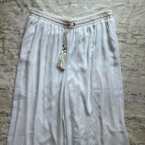 Sheer layer over white opaque layer high rise wide leg pants, elastic drawstring waist.