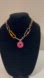 Open Edit from Nordstrom stylish gold paper clip chain necklace with a pink circular pendant and orange link. Link holding the pink pendant has rhinestones. Ideal for a chic fun look.