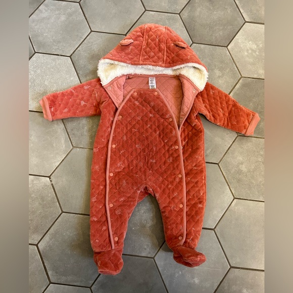 Cozy quilted puffer jacket. Features a hood with cute ears. Soft and warm material. Perfect for chilly days.