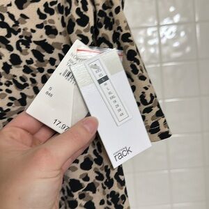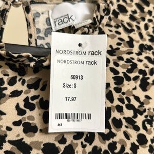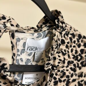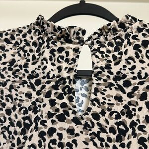 Size small (women’s) cheetah print half puff sleeve blouse. BNWT. Features keyhole closure around neck and ruffled neck line.