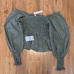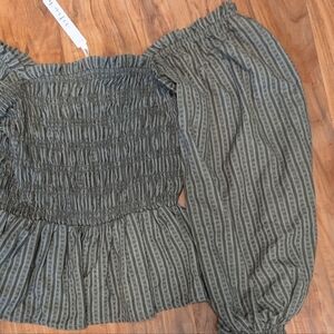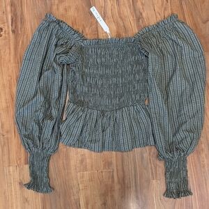 Brand New with tags Nordstrom Rack top. Brand is Maiser in a size medium. Green striped paisley print. Features balloon long sleeves, ruching, and ruffles along neckline and peplum bottom.