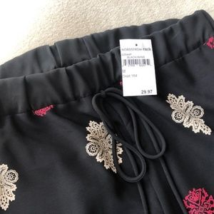 Black flowing, lightweight wide leg black pant with dark red and cream design.