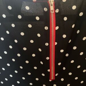Charming top featuring a playful polka dot design with red zipper and neckline touches. Perfect for any occasion. pit to pit 21", length 26"