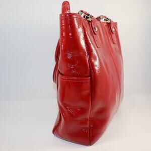 Bold and stylish genuine leather tote by Nordstrom in a high-shine red patent finish. Spacious interior with zip pocket and two open side pockets for organization. Polished silver-tone hardware and sturdy rolled handles add to its structured silhouette. Minor signs of wear on bottom corners. Perfect everyday carry with standout color and quality leather construction.