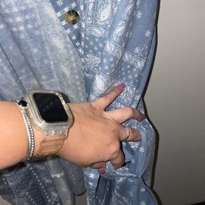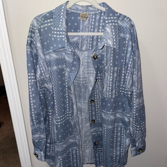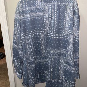 Blue paisley printed shacket. Super soft fleece inside and pockets on the side like a jacket. Can be worn either as an oversized shirt or over a shirt as a jacket/flannel. Never worn!