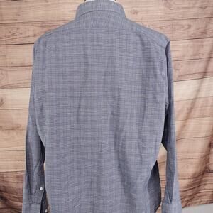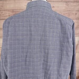 Style: Mens long sleeve button-front dress shirt in a blue micro-check plaid pattern with a trim fit silhouette.