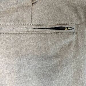 Khaki, one back pocket zips, tab and zip front closure, straight leg