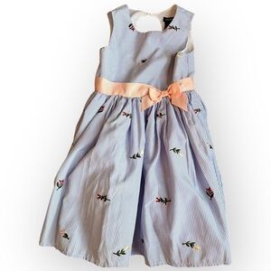Charming kids dress featuring a blue striped pattern with pink accents. Perfect for any occasion.