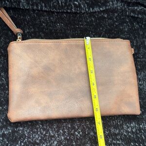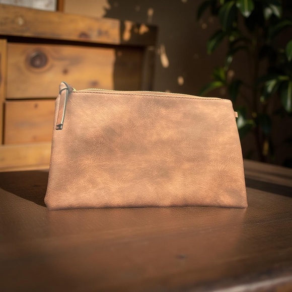Elegant tan clutch. Perfect for any occasion. Sleek and stylish design.