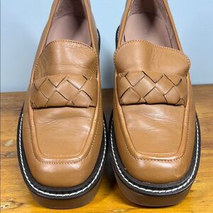 Stylish tan leather loafers. Features woven detail. Comfortable and chic.