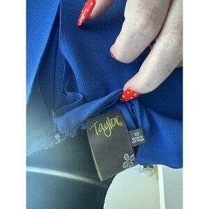 The Nordstrom Taylor Bright Blue Ruffle Sleeveless Shift Dress in size 10 is a stylish and versatile piece perfect for various occasions. Made from a blend of polyester and spandex, this knee-length dress features a flattering round neckline, ruffle accents, and a convenient zipper closure. The bright blue color adds a pop of color to your wardrobe, while the machine washable fabric ensures easy care. Ideal for summer, fall, or spring events, this dress offers a comfortable and stretchy fit for all-day wear.