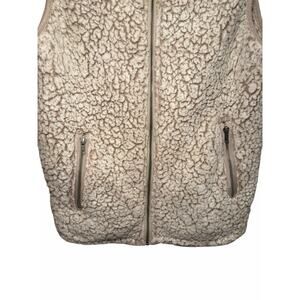 This cream and brown vest features a soft shearling style, perfect for adding warmth to any outfit. Nice warm collar to keep you warm. Nubby thick fabric. Full zipper, front zipper pockets. Sleeveless vest perfect for layering.