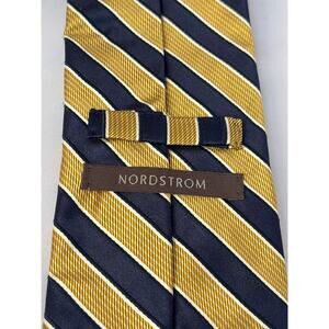 Elevate your style with this sophisticated Nordstrom tie. Crafted from luxurious silk, this tie features a classic stripe pattern in a handsome combination of gold, yellow, cream, and navy blue. Handmade with meticulous attention to detail, it measures 60" in length, making it a versatile accessory for any occasion. Perfect for adding a touch of elegance to your professional or formal attire. Make a statement without saying a word!
