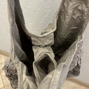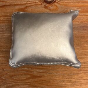 • unstructured shape with self-storage design folds into a chic silver faux-leather zippered pouch