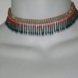 The trend of the season has been rejuvenated with fringe, texture and lots of color in this swingy choker strung with a mix of seed beads and metallic charms.