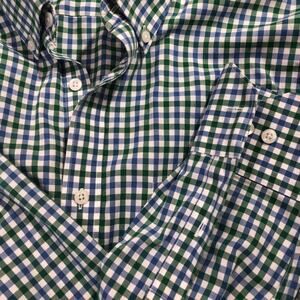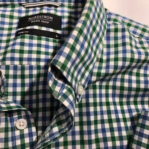 Nordstrom Trim Fit Blue Green White Plaid Checked Men Large Wrinkle Free Cotton
