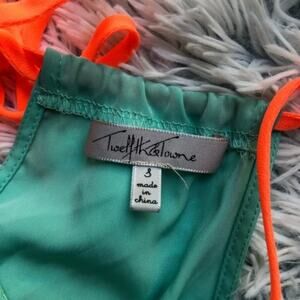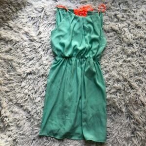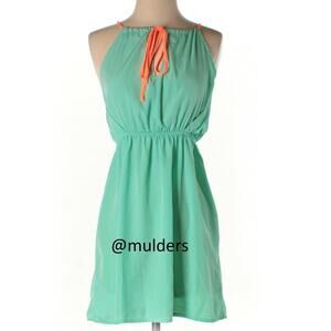 Size small casual dress from Twelfth & Towne at Nordstrom. Green A-line dress with neon orange tie neck halter. Sleeveless. 100% polyester. Good condition.