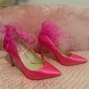 Chic pink heels with playful feather accents. Perfect for a bold fashion statement.
