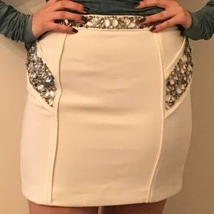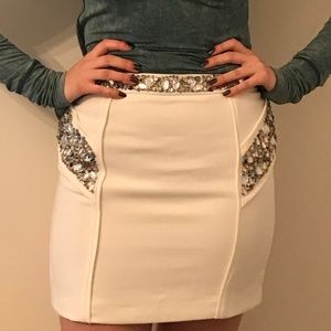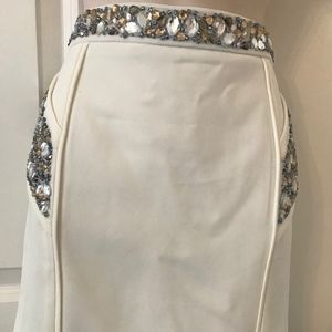 Nordstrom white jewel embellished mini skirt with pocket and waistband detailing. Exposed back zipper, lined, new with tags. Size M, 100% polyester
