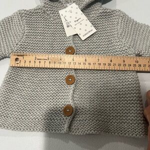 The product is a Nordstrom baby sweater in size 6 months, made from organic cotton and featuring a cardigan style in a gray color. It is designed with knit fabric, providing a cozy and comfortable option for your little one's wardrobe. Perfect for keeping your baby warm and stylish during the colder months.