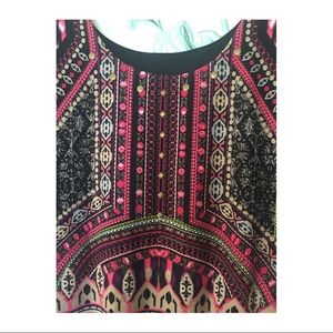 Printed overlay dress . My mom purchased for a wedding but it was too long for her! Very comfortable fabric and beautiful design. Please see third picture for a better view of the pattern. 95% polyester 5% spandex. Crew neck, short sleeve, approx 36" length