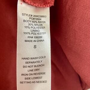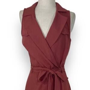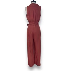 Brick red sleeveless wrap jumpsuit in Excellent pre owned condition, looks new with no notable flaws. Only worn once. Size small but runs larger. Row A brand from Nordstrom. Hidden zipper & snap closure, the notched collar surplice bodice wraps around front & snaps at the waist. belt loops with self tie, faux flap pockets at chest. Flowing loose legs. Washable rayon, nylon polyester blend. Comfortable while still classy.