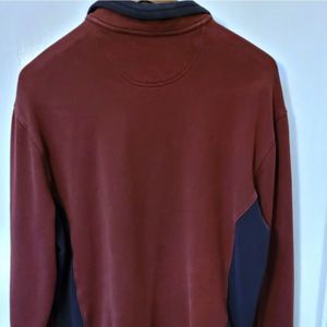 Nordstom's two-tone pullover sweatshirt maroon/brown. with navy collar, sides and stripe on stretch cuffs. No pockets with quarter zip.