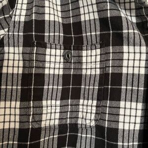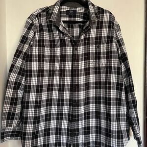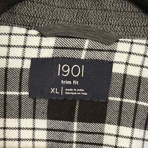 Sharp black and white plaid flannel shirt, from Nordstrom brand, 1901 (in color: black caviar white plaid), size x-large. For reference this fit my husband, who is 6’4”.