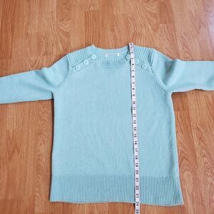 Lots of details in this cozy knit sweater includes buttons and ribbing along the shoulder.