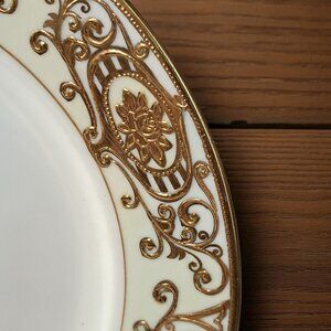 Noritake 175 Oval Serving Platter 10" Gold Christmas ball pattern with raised gold borders.