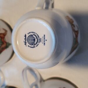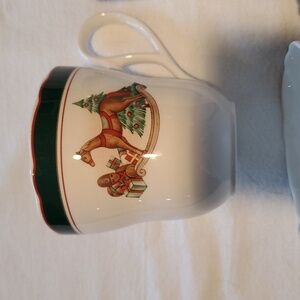 Enjoy your favorite beverages with this charming Holiday Rocking Horse Mug Set. Featuring a festive design with a rocking horse and gifts, these mugs add a touch of holiday spirit to your dining experience. The white base color complements any table setting. Check out all pics for details and approximate measurements. 1 cup has a small chip as shown in pics.