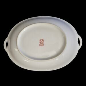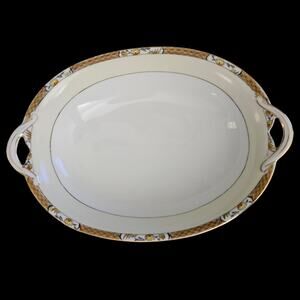 Beautiful vintage Noritake “Azalea Gold” oval handled serving dish. This elegant porcelain piece features the signature gold lattice border with white azalea-style blooms and yellow centers, trimmed with gold on rim and handles. Marked Noritake M Hand Painted / Made in Japan / U.S. Design Pat. Applied For, dating to the 1918–1921 period.