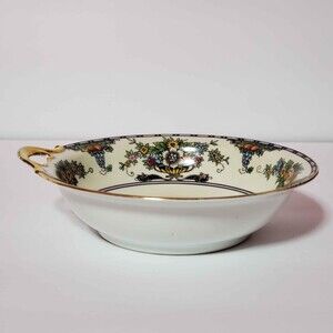 Vintage Noritake bowl with handle. Floral and fruit design. Flowers in a basket, fruit and floral border. Gold handle shows signs of wear (see pictures). 7.75" across and 2" tall.