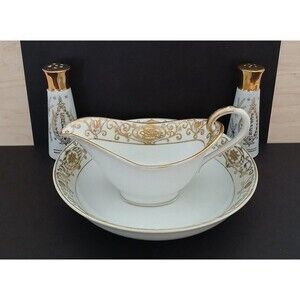 Noritake Japan Hand Painted Embossed Gold Japanese Gravy Boat-Bowl-Salt & Pepper