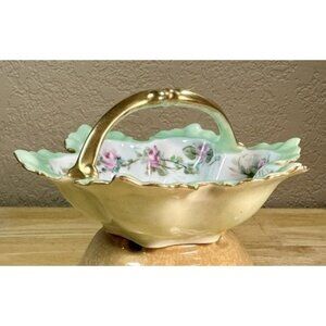 This beautiful fine porcelain piece has the Green Noritake Nippon Mark that distinguishes the Noritake line of pieces exported to the USA as blanks to be hand painted in studios during the Arts & Crafts Era circa 1911.Featuring hand painted pink roses, lovely shades of green with gold accents and trim. A perfect display piece that would be gorgeous on a vanity with little soaps, used as a jewelry or trinket dish, on an entry or side table with mints or candies....