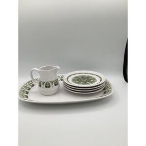 This set includes a vintage Noritake Progression Palos Verde pattern featuring six pieces: one serving plate, four salad plates, and a creamer. The round plates are perfect for serving salads and other dishes, while the creamer is ideal for adding milk or cream to your coffee or tea. The stoneware material is both microwave and dishwasher safe, making it easy to use and clean. This set is a great addition to any kitchen, especially for those who love retro style.