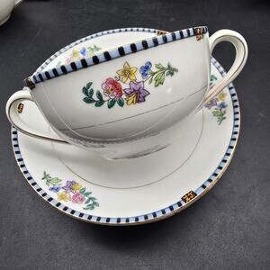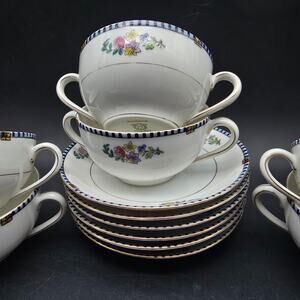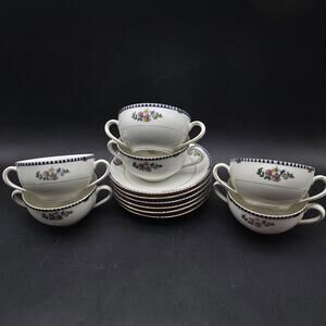 This set includes six Noritake bouillon cups and six saucers in Sheridan pattern with handplanted blue and black boarder with a floral motif with gold trim
