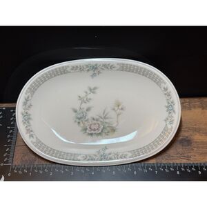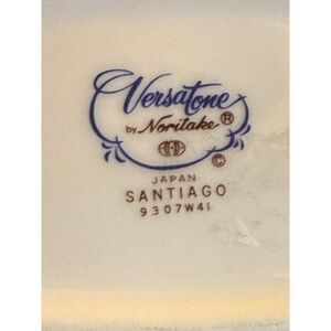 Lovely oval vegetable/serving bowl from the Noritake Versatone line in the discontinued Santiago pattern. This design features soft pastel florals — blue, sage, and mauve — on warm ivory stoneware with a subtle textured lattice border. A beautiful, functional piece for everyday use or for collectors completing a set.