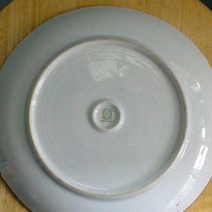 Noritake hand painted bridge over water serving platter. Condition is Used. This item has no dents or scratches. Some normal wear shows on the bottom and along the outer edge at the bottom of the picture. Colors are: black rim and handles, orange/gold band, followed by a thin black band with picture of trees on the left with bridge spanning water in the center. Size is 10" diameter; 1.25" height.