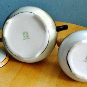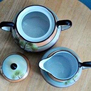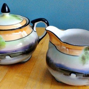 Noritake hand painted scene of bridge over water cream and sugar. Pieces have no scratches or nicks. Decoration is black handle and black rim; gold is under the black, followed by another thin black line and then the beautiful picture of the tree to the right, bridge over the water and mountains in the distance. Size of the creamer is: 4.25" diameter across the top; 3" height to top of lip. Sugar bowl is: approximately 6" from handle to handle; approximately 4" tall to top of lid handle.