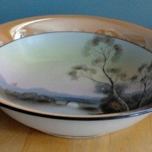 Noritake hand painted bridge over water serving bowl. Item has no nicks or scratches. Does show some wear on the bottom. Bowl is rimmed in black with orange/gold band, followed by a thin black line. The picture is of a tree by the water with a bridge. Size is: 8.75" diameter; 2.25" height. Condition is Used.